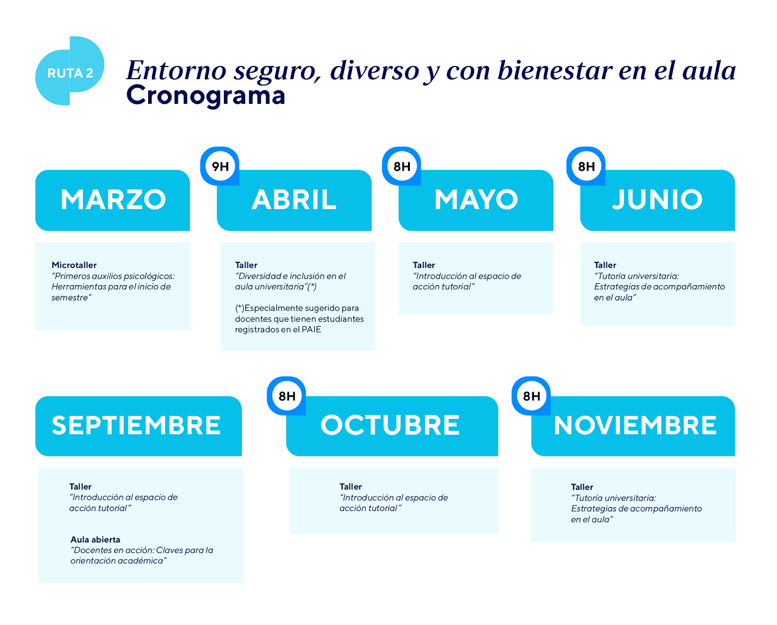Esta ruta formativa tiene como propósito fortalecer las capacidades docentes para promover el bienestar emocional del estudiantado, brindar orientación académica oportuna y gestionar la diversidad en el aula. A continuación, les compartimos el cronograma del programa: